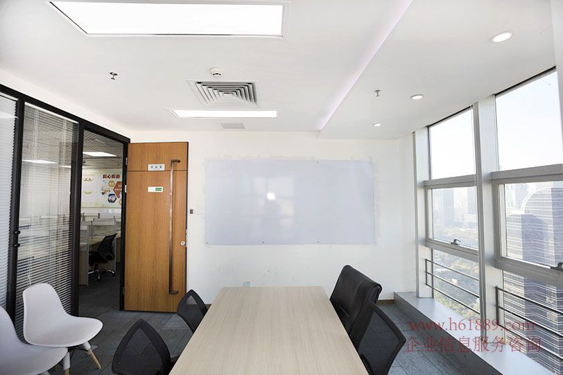 3、物业位于大厦高层、大气的双开玻璃门、里面有5个隔间、1大厅、东北采光、户型方正、全办公家私、近电梯口