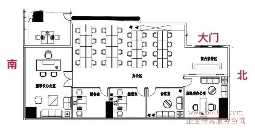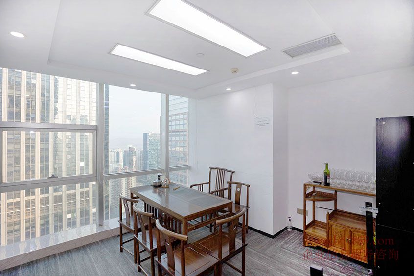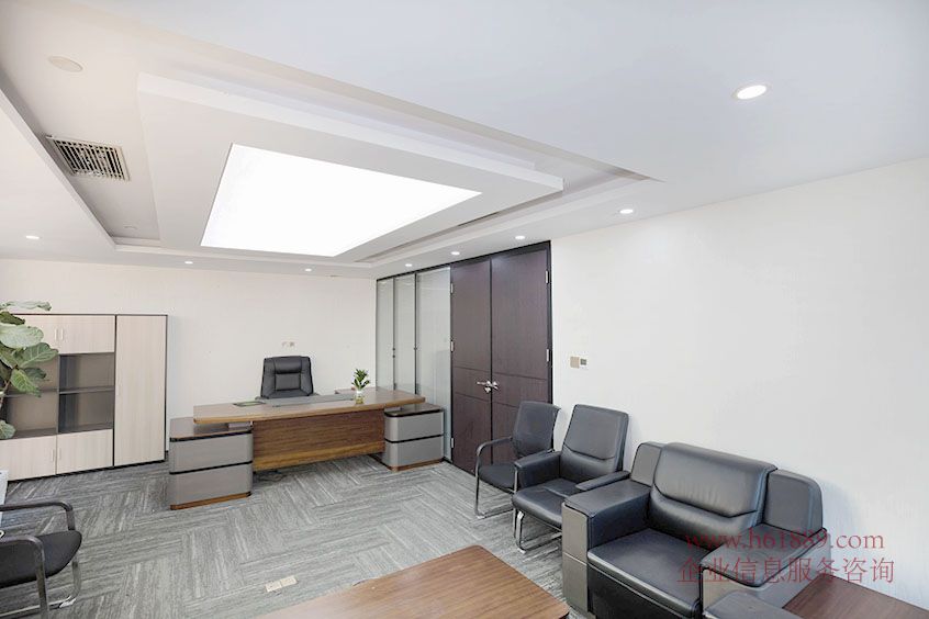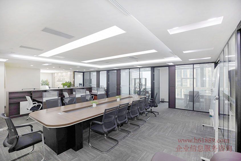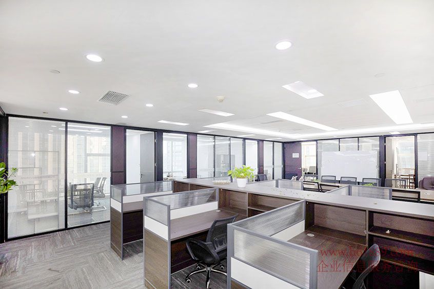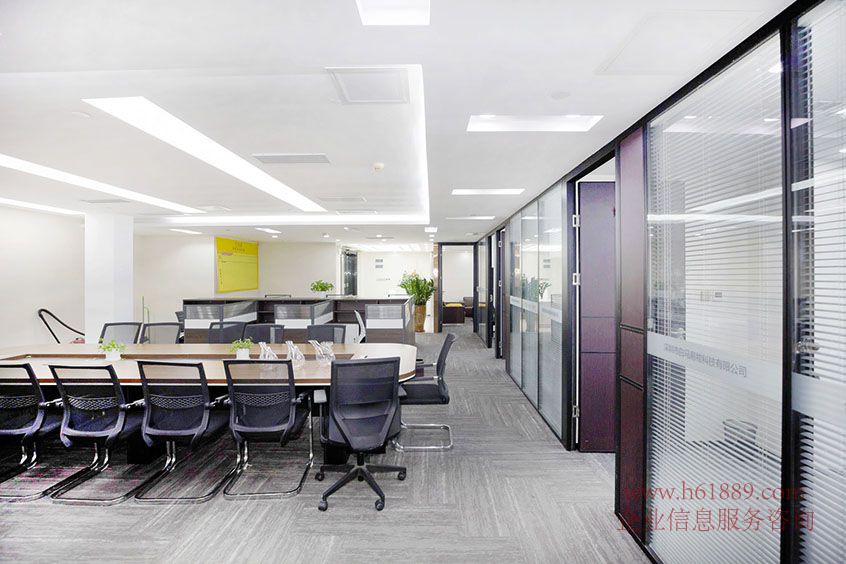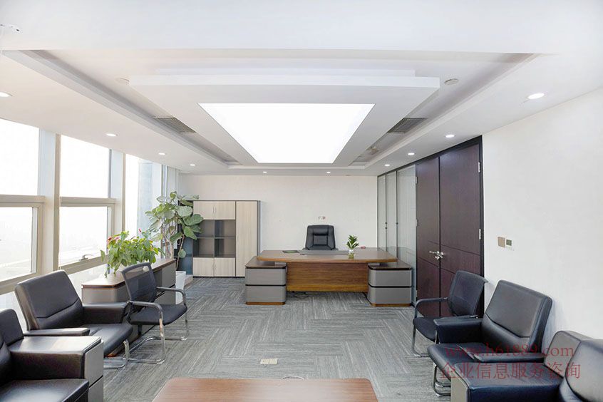 3、物业位于大厦高层、大气的双开玻璃门、里面有5个隔间、1大厅、东北采光、户型方正、全办公家私、近电梯口