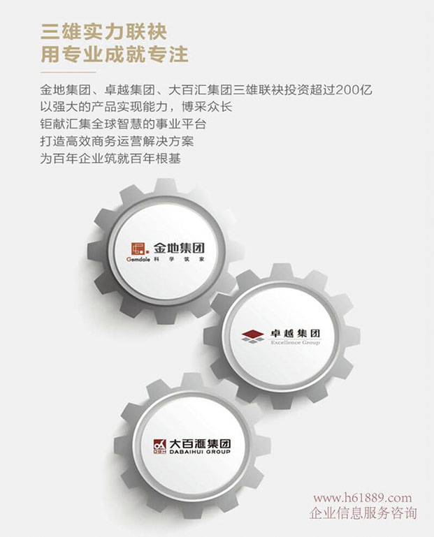 金地中心:三雄实力联袂、用专业成就专注、金地集团、卓越集团、大百汇集团三雄联袂投资超过200亿、以强大的产品实现能力、博采众长、钜献汇集全球智慧的事业平台、打造高效商务运营解决方案、为百年企业筑就百年根基